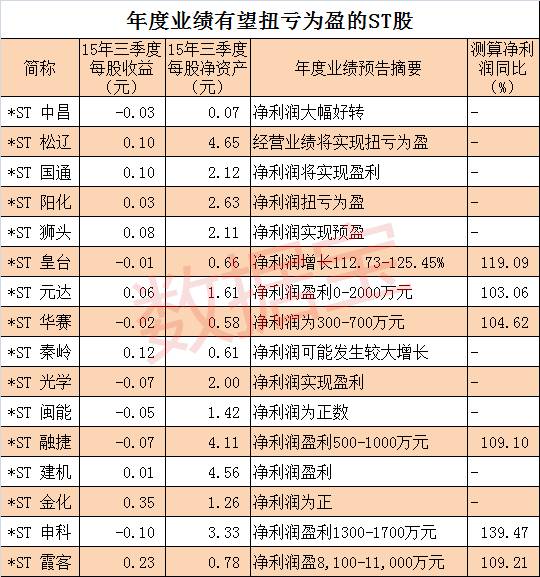 目前,两市已有22家ST公司(ST、*ST统称为ST)发布2015年年度业绩预告(剔除暂停上市公司),其中,16家公司预计今年业绩将实现扭亏为盈。6家已公布业绩预测值的公司测算净利润同比全部翻番。增幅最大的*ST申科(002633),预计2015年实现净利润1300-1700万元,较去年同期增长139.47%。紧随其后的*ST 皇台,预计今年净利润同比增幅高达112.73-125.45%。此外,*ST霞客(002015)、*ST融捷(002192)、*ST华赛(000068)、*ST元达(002417)预计全年净利润同比增幅翻番。