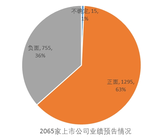 证券时报·券商中国记者统计了已公布业绩预告的2065家上市公司公告发现,63%的上市公司业绩预告偏正面,36%偏负面,其余15家上市公司为不确定状态。