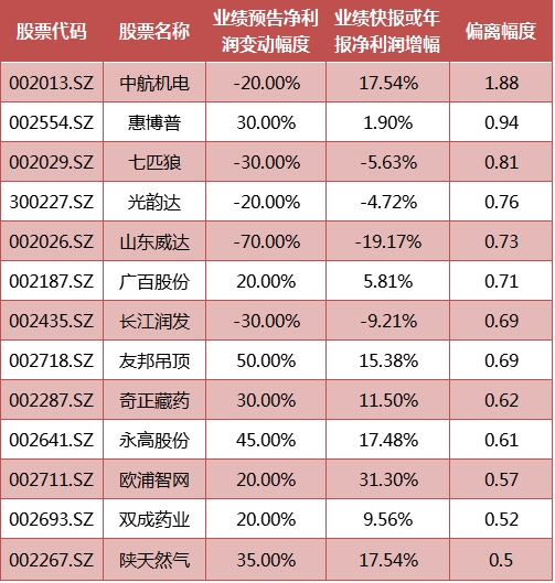 根据现有数据,业绩快报或年报中净利润增减幅,与业绩预告中净利润变动幅度相比,哪些上市公司这两项数据差异最大?证券时报。券商中国记者列出了偏离幅度在50%以上的上市公司名单,其中,中航机电业绩预告净利润变动幅度为-20%到10%,但根据其业绩快报,其利润增长17.54%;惠博普业绩预告利润增长0%到30%,实际增幅为1.9%。