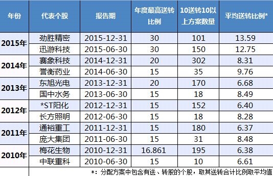以10送转10为门槛,2014年年报共有302只个股入围,2010-2013年年报期间比较稳定,平均175家。而2015年仅中报期间就有高达150家公司的分配方案达到门槛之上,这数据超过了2010-2014年中报的总和。在2015年年报尚未大规模披露的情况下,10送转10以上的预案已然超过百家,无论从数量还是送转比例来看,2015年都将创造高送转的新纪录。