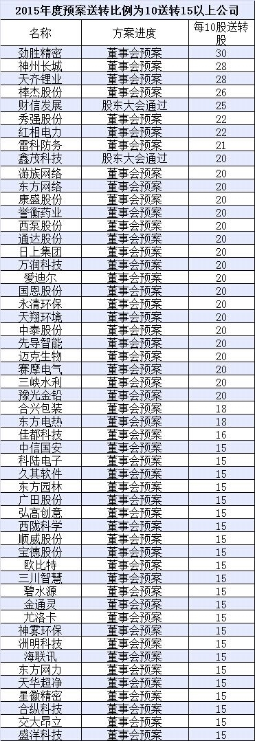 总的来看,推出高送转方案的公司中,中小板和创业板公司仍旧占据着可观的份额。在97家推出每10股转增10股预案的公司中,有74家公司分属于中小板和创业板。(证券日报)
