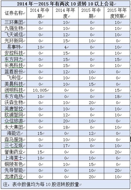 相较于单个财季高送转,能在不同财季连续高送转更加难能可贵。数据显示,自2014年以来(算上各年中期),26股出现两次10送转10以上的情形,如三环集团,2014年度实施10派5转10的分配方案,2015年度又提出10派3.5转10的预案;又如飞天诚信,2014年度实施10派7.6转12的分配方案,2015年度又提出10转10的预案。