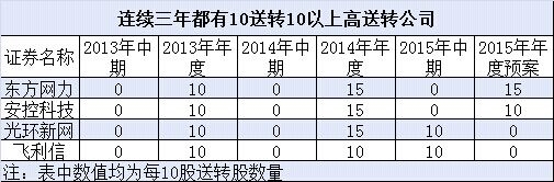 而东方网力、安控科技、光环新网、飞利信4股连续三年都有10送转10以上高送转(含预案)。