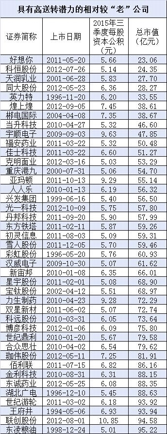 2014年以来已累计有356家公司挂牌上市。我们筛选出2015年三季度每股资本公积高于4元、总市值低于100亿元,且当前股价高于40元的公司,共33家,其中5家已披露或预披露2015年度送转方案,还剩28家,名单如下: