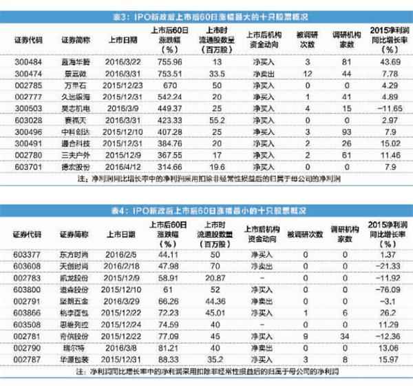 从基本面状况来看,新股上市后60日涨幅与企业2015年净利润增长率的相关系数为0.21,呈现出了弱相关关系。表3中涨幅最大的10只股票2015年归属于母公司的净利润同比增长率的均值为9.42%,净资产收益率(ROE)平均为2.4%;而表4中涨幅最低的10只股票2015年平均净利润增长率仅为-5.69%,ROE均值为1.48%,远低于高涨幅的个股的数据。可见,新兴产业、热点题材、基本面状况优异的个股更容易得到超预期的市场表现。入场选择新股投资标的时,也可以此作为参考。