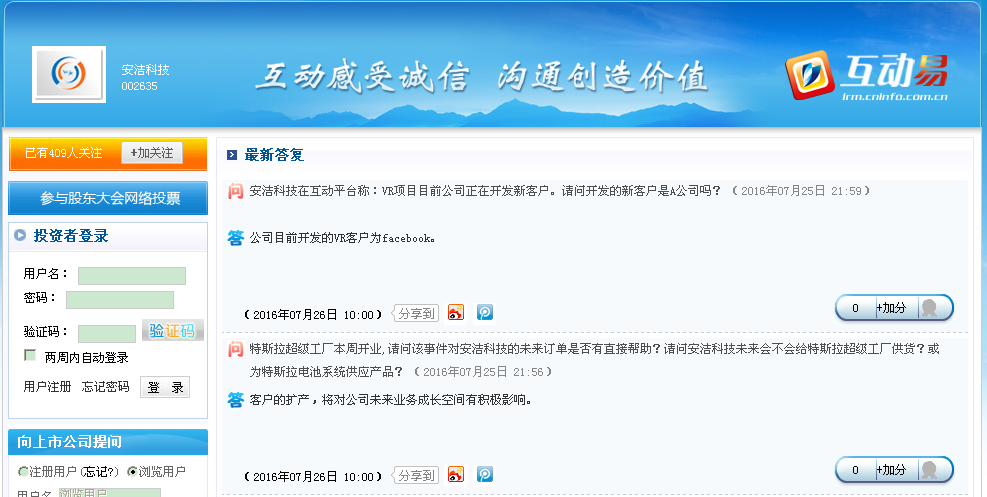 此外,投资者亦十分关心公司与特斯拉之间的合作。对此,公司在回复时表示,公司目前已经接到新能源汽车业务的量产订单。有投资者问及,特斯拉超级工厂本周开业,对安洁科技的未来订单是否有直接帮助?安洁科技未来会否给特斯拉超级工厂供货,或为特斯拉电池系统供应产品?对此,公司回答,客户的扩产,将对公司未来业务成长空间有积极影响。