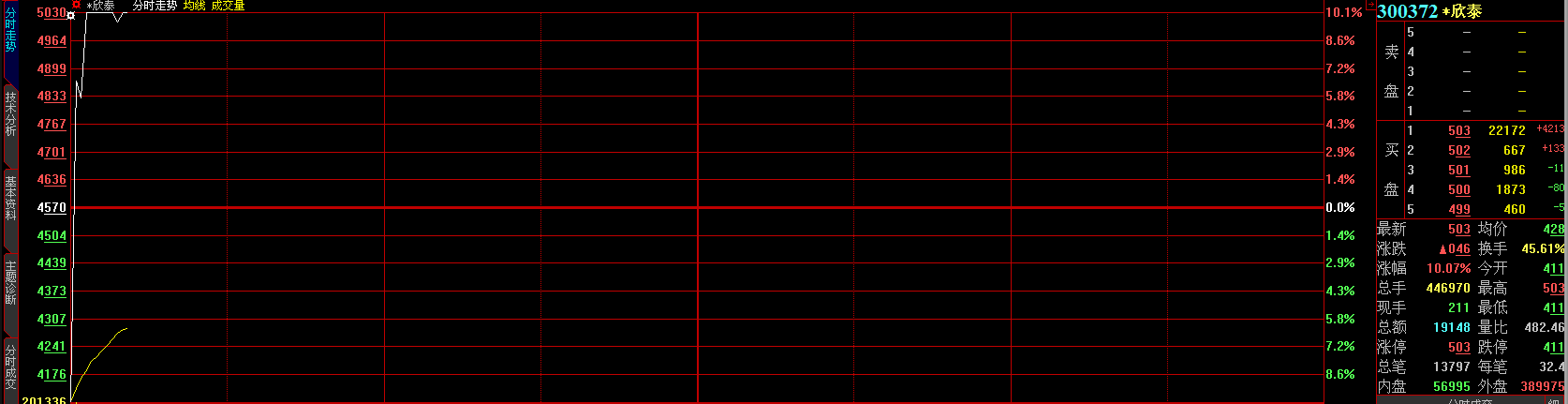 截至上午9点40分,欣泰电气上涨10.07%,报收5.03元/股,当日成交额1.93亿元;出现在买一的报盘量多达4万手。