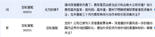 有投资者在互动平台向巨轮智能提问:请问深港通快开通了,公司是否会抓住此次机会做大公司市值?在开通前三个月内有何大动作来吸引投资者关注?对此,公司今日回复,已被列入深港通股票名单。