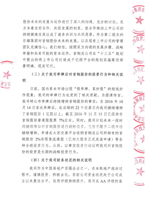石榴集团表示,自2016年10月14日首次举牌后,在后续的22个交易日内其继续增持了首钢股份1亿股以上,截至2016年11月15日已经持有首钢股份普通股股票7%左右。同时,石榴集团计划未来一段时间继续增加对首钢股份进行战略投资,包括不限于二级市场继续增持,申请在大宗交易平台收购首钢总公司所持有的首钢股份2%非限售流通股(已向大股东正式发函申请)等各种合规投资行为。