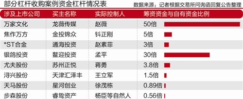 据21世纪经济报道记者梳理,买壳方筹资资金与自有资金比例最高的就是万家文化,为50倍,其新股东龙薇传媒仅出资了6000万元,却撬动了30亿元的外来资金;其次是银鸽投资的新股东鳌迎投资,以30倍的杠杆率完成了控股权收购。