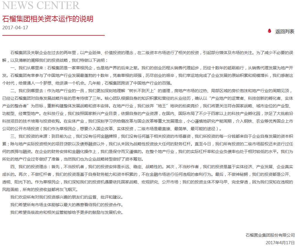 石榴集团在说明中表示,房地产市场的过热、局部区域的房价泡沫和地产行业的周期见顶,已经让石榴集团对自身发展战略升级的思考持续了三年。核心团队根据自身的知识积累和曾经的从业经历,确认以“产业地产的运营者、科技创新的孵化者、实体产业的整合者”为目标,重新构建整体发展战略和资本安排。在地产行业,我们放弃“地王”地块的拍卖竞价,我们将更关注符合国家战略、城市定位的产业型、功能型、经营型地产。在科技行业,我们按照国家新兴产业目录,依据自身的产业资源,在国内、国际布局了不少于四家以上的科技产业孵化园,涉足了大批前沿科技项目的技术培育与投资收购。在实体产业,我们深刻学习供给侧改革与国企改革等重大发展理念,小心谨慎地研究产能周期,介入钢铁、农业等优秀国企上市公司的公开市场投资(我们作为草根民企,想要介入国企改革、实体投资,二级市场是最直接、最简单、最可能的途径)。