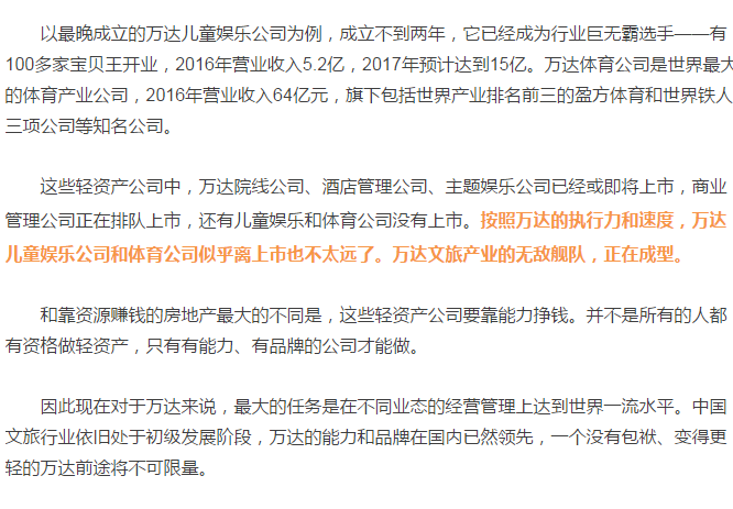 现在,万达手里的轻资产公司包括万达商业管理、万达电影、万达酒店管理、万达主题娱乐、万达儿童娱乐、万达体育以及大健康产业。除了商业管理公司之外,其他公司瞄准的都是处于快速增长期的文旅市场,中国的消费升级运动将会催生一批文旅产业巨头,万达的这几家公司都是行业里最有竞争力的选手。