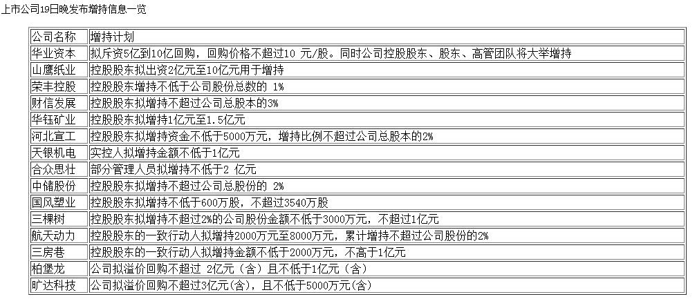 华业资本19日晚公告称,控股股东华业发展计划未来6个月内累计增持公司1%至2%的股份,此次增持计划未设定价格区间,将基于对公司股票价值的合理判断,并根据公司股票价格波动情况及资本市场整体趋势,逐步实施增持计划。