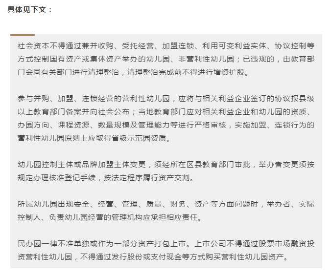 相关研究人士认为,此次《意见》中民办幼儿园“可以分类、不能上市”的要求超出市场预期,预计此板块上市公司未来面临的政策形势不容乐观。更多详细内容请扫码关注上海证券报微信公众号。