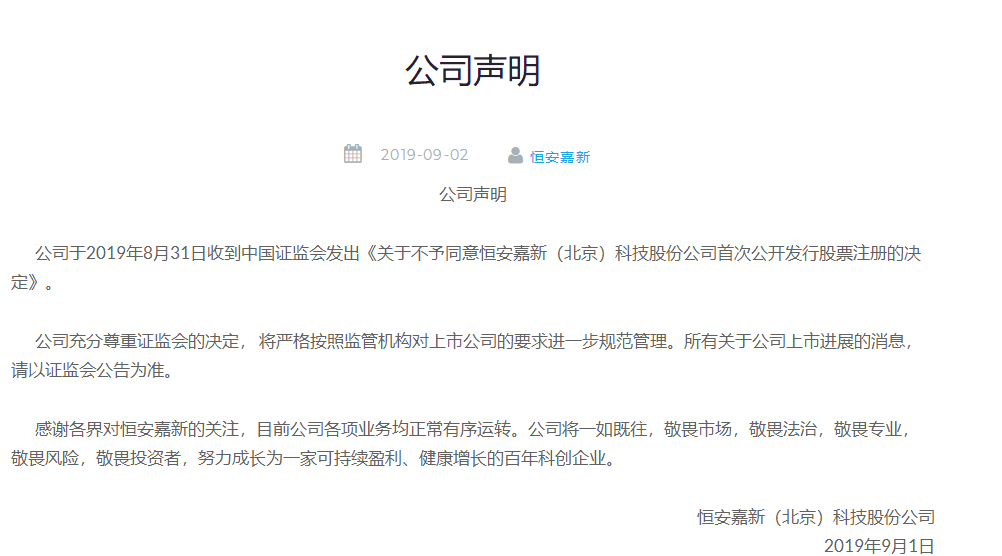 上证报中国证券网讯(记者 祁豆豆)9月2日,恒安嘉新在公司官网发布声明称,公司于2019年8月31日收到中国证监会发出《关于不予同意恒安嘉新(北京)科技股份公司首次公开发行股票注册的决定》。充分尊重证监会的决定, 将严格按照监管机构对上市公司的要求进一步规范管理。