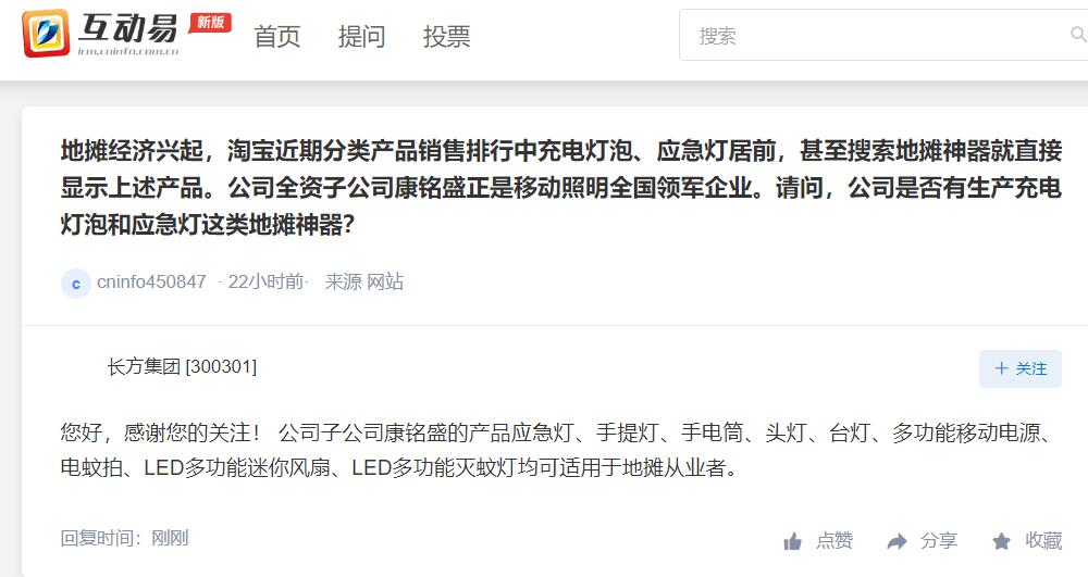 长方集团:子公司康铭盛的手电筒、电蚊拍等产品均可适用于地摊从业者