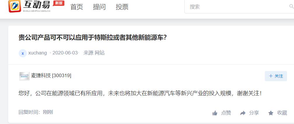 上证报中国证券网讯 麦捷科技6月5日在互动平台上回答投资者提问时表示,公司在能源领域已有所应用,未来也将加大在新能源汽车等新兴产业的投入规模。