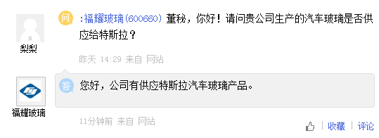 福耀玻璃:公司有供应特斯拉汽车玻璃产品