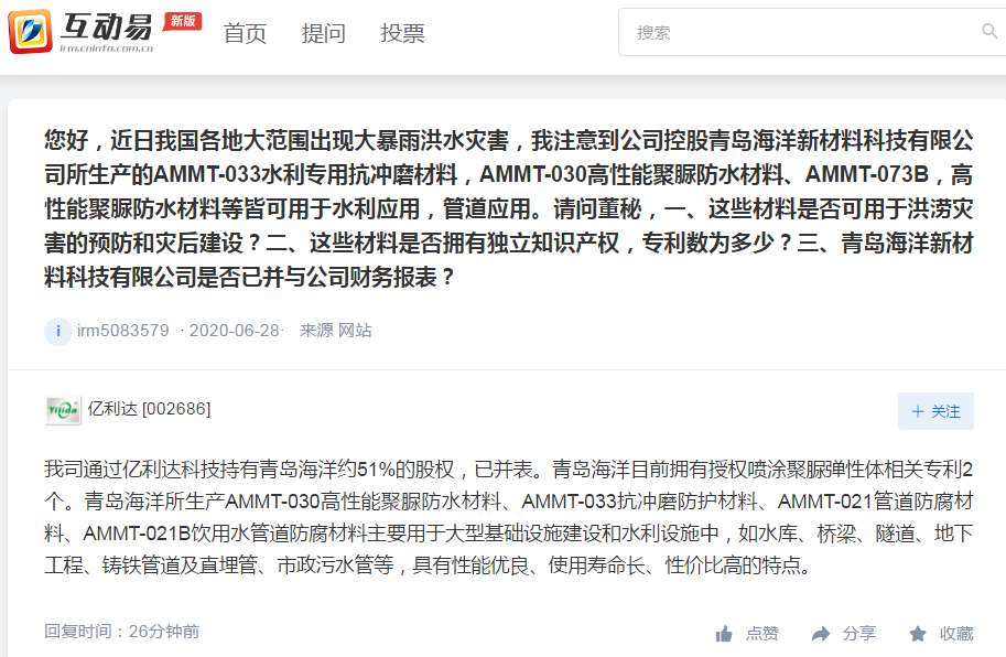 上证报中国证券网讯 亿利达7月2日在互动平台回答投资者提问时表示,公司旗下青岛海洋所生产AMMT-030高性能聚脲防水材料、AMMT-033抗冲磨防护材料、AMMT-021管道防腐材料、AMMT-021B饮用水管道防腐材料主要用于大型基础设施建设和水利设施中,如水库、桥梁、隧道、地下工程、铸铁管道及直埋管、市政污水管等,具有性能优良、使用寿命长、性价比高的特点。