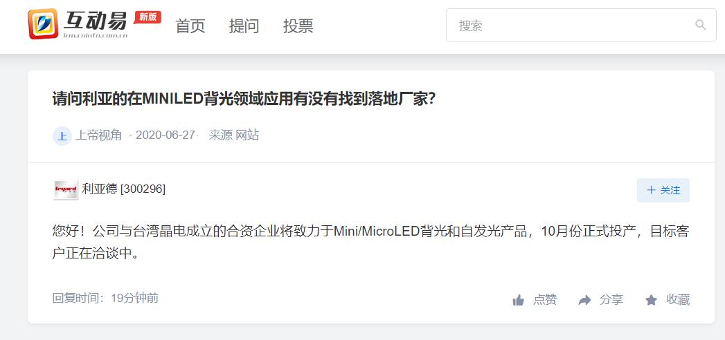 上证报中国证券网讯 利亚德14日在互动平台回答投资者提问时表示,公司与台湾晶电成立的合资企业将致力于Mini/MicroLED背光和自发光产品,10月份正式投产,目标客户正在洽谈中。