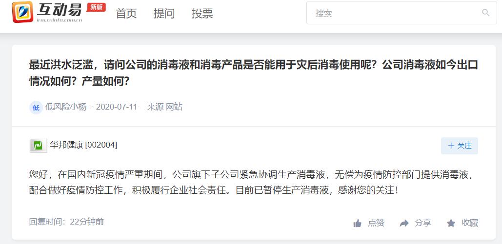 华邦健康:此前有生产消毒液 目前暂停生产