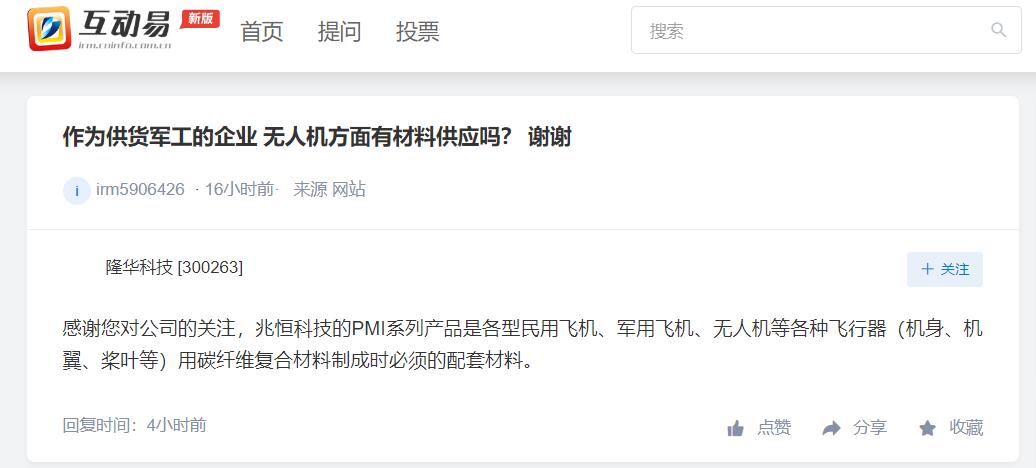 上证报中国证券网讯 隆华科技24日在互动平台回答投资者提问时表示,兆恒科技的PMI系列产品是各型民用飞机、军用飞机、无人机等各种飞行器(机身、机翼、桨叶等)用碳纤维复合材料制成时必须的配套材料。