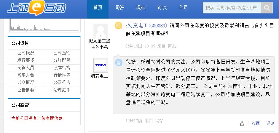 上证报中国证券网讯 特变电工27日在互动平台回答投资者提问时表示,公司印度特高压研发、生产基地项目累计投资金额超过10亿元人民币;2020年上半年受印度当地疫情防控政策要求,印度公司出现停工停产情况,上半年经营亏损,目前实施封闭式生产管理,部分复工。公司目前在东南亚、中亚、非洲等地的部分海外输变电工程已陆续复工,公司将加快项目建设,尽量追回延缓的工期。