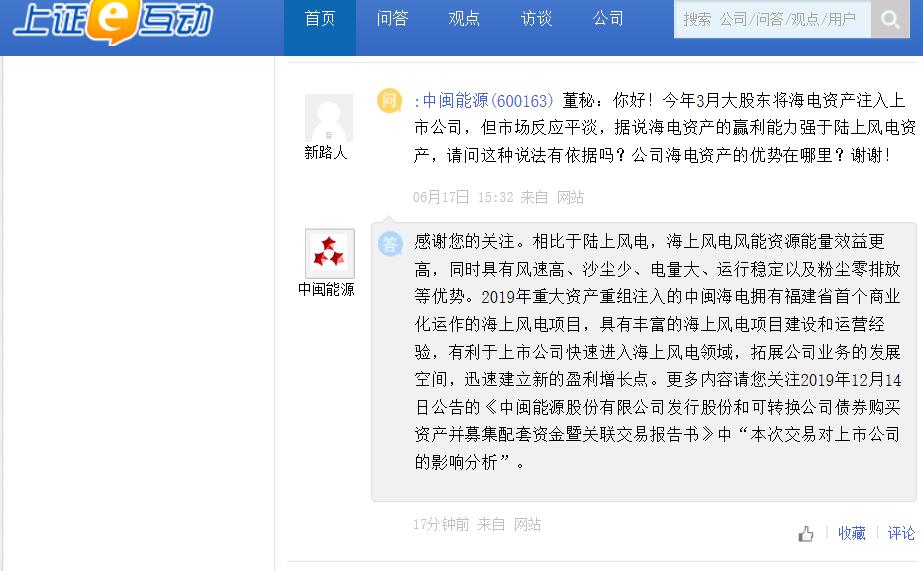 上证报中国证券网讯 中闽能源28日在互动平台回答投资者提问时表示,相比于陆上风电,海上风电风能资源能量效益更高,同时具有风速高、沙尘少、电量大、运行稳定以及粉尘零排放等优势。2019年重大资产重组注入的中闽海电拥有福建省首个商业化运作的海上风电项目,具有丰富的海上风电项目建设和运营经验,有利于上市公司快速进入海上风电领域,拓展公司业务的发展空间,迅速建立新的盈利增长点。
