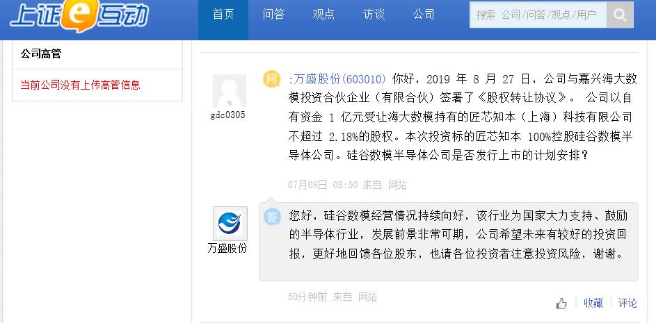 上证报中国证券网讯 万盛股份29日在互动平台回答投资者提问时表示,硅谷数模经营情况持续向好,该行业为国家大力支持、鼓励的半导体行业,发展前景非常可期,公司希望未来有较好的投资回报,更好地回馈各位股东。