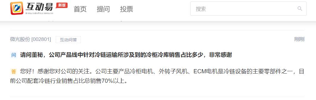上证报中国证券网讯 微光股份31日在互动平台回答投资者提问时表示,公司主要产品冷柜电机、外转子风机、ECM电机是冷链设备的主要零部件之一,目前公司配套冷链行业销售占比总销售70%以上。