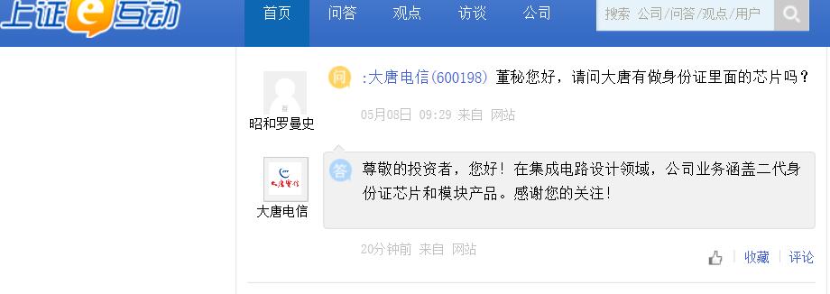上证报中国证券网讯 大唐电信31日在互动平台回答投资者提问时表示,在集成电路设计领域,公司业务涵盖二代身份证芯片和模块产品。