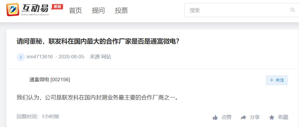 上证报中国证券网讯 通富微电13日在互动平台回答投资者提问时表示,公司是联发科在国内封测业务最主要的合作厂商之一。