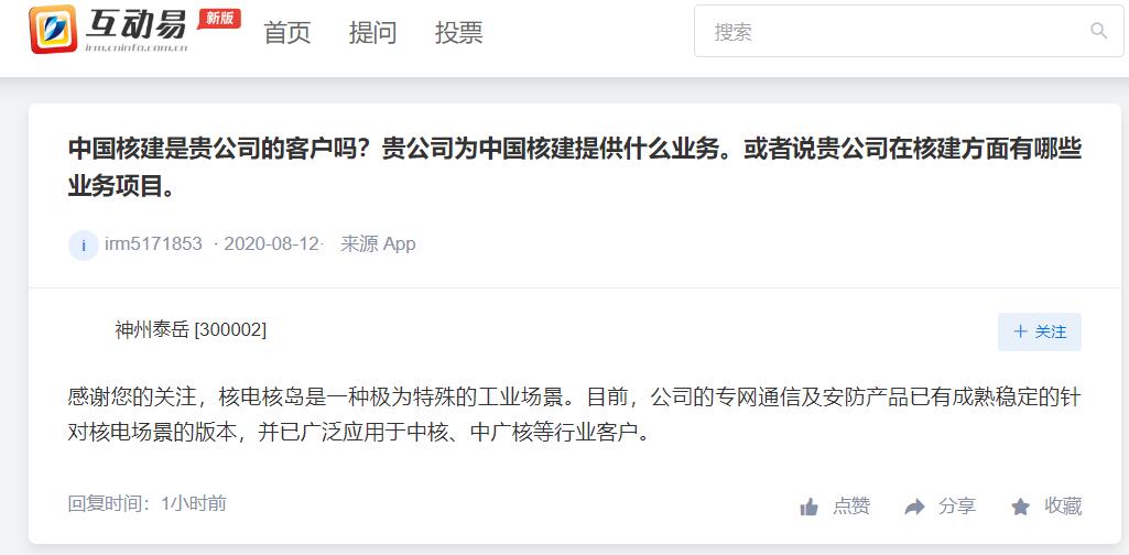 神州泰岳:专网通信及安防产品已广泛应用于中核、中广核等行业客户