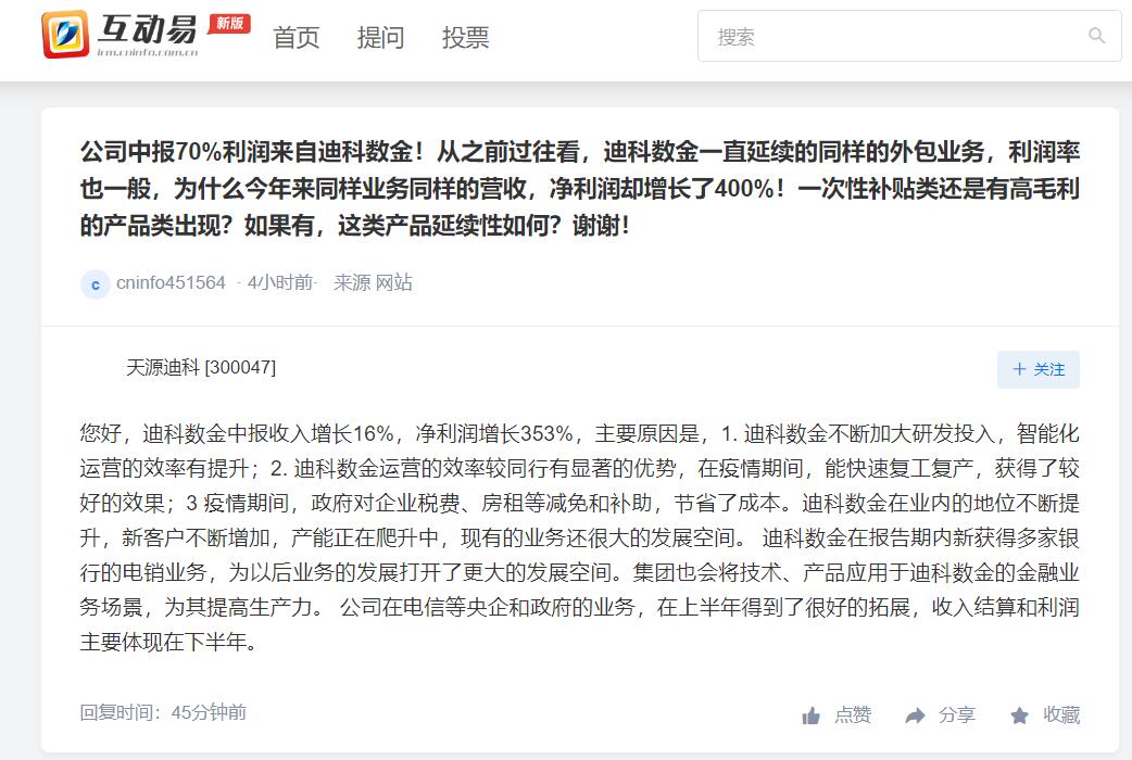 上证报中国证券网讯 天源迪科20日在互动平台回答投资者提问时表示,公司在电信等央企和政府的业务,在上半年得到了很好的拓展,收入结算和利润主要体现在下半年。