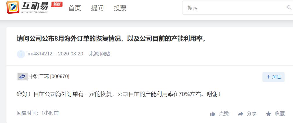 中科三环:海外订单有所恢复 公司目前产能利用率在70%左右