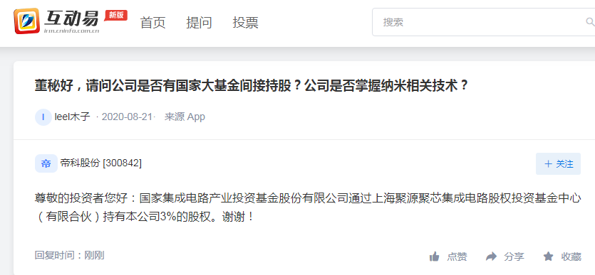 上证报中国证券网讯 帝科股份8月24日在互动平台回应是否有国家大基金间接持股时表示,国家集成电路产业投资基金股份有限公司通过上海聚源聚芯集成电路股权投资基金中心(有限合伙)持有本公司3%的股权。