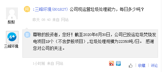 上证报中国证券网讯 三峰环境8月28日在互动平台回答投资者提问时表示,截至2020年6月30日,公司已投运垃圾焚烧发电项目19个(不含参股项目),垃圾处理规模为22350吨/日。