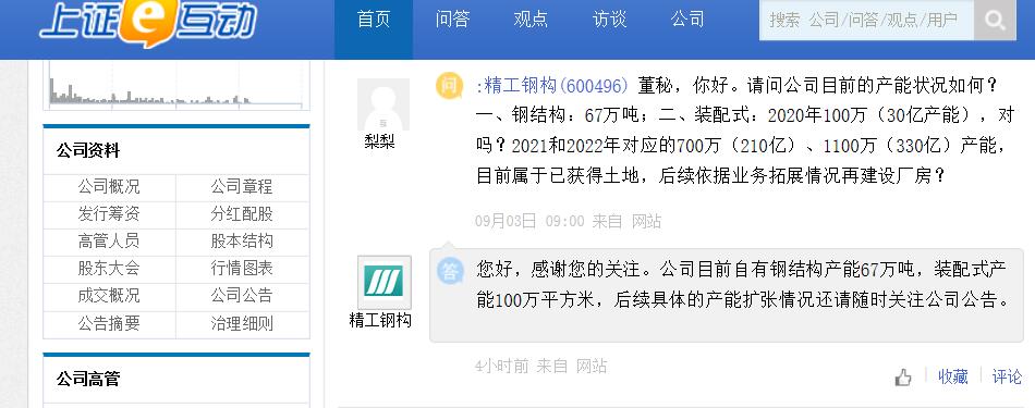 精工钢构:公司目前自有钢结构产能67万吨,装配式产能100万平方米