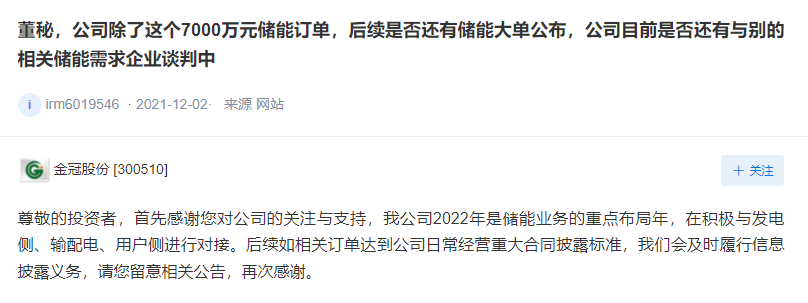 上证报中国证券网讯 金冠股份12月9日在深交所互动易平台表示,2022年是储能业务的重点布局年,在积极与发电侧、输配电、用户侧进行对接。