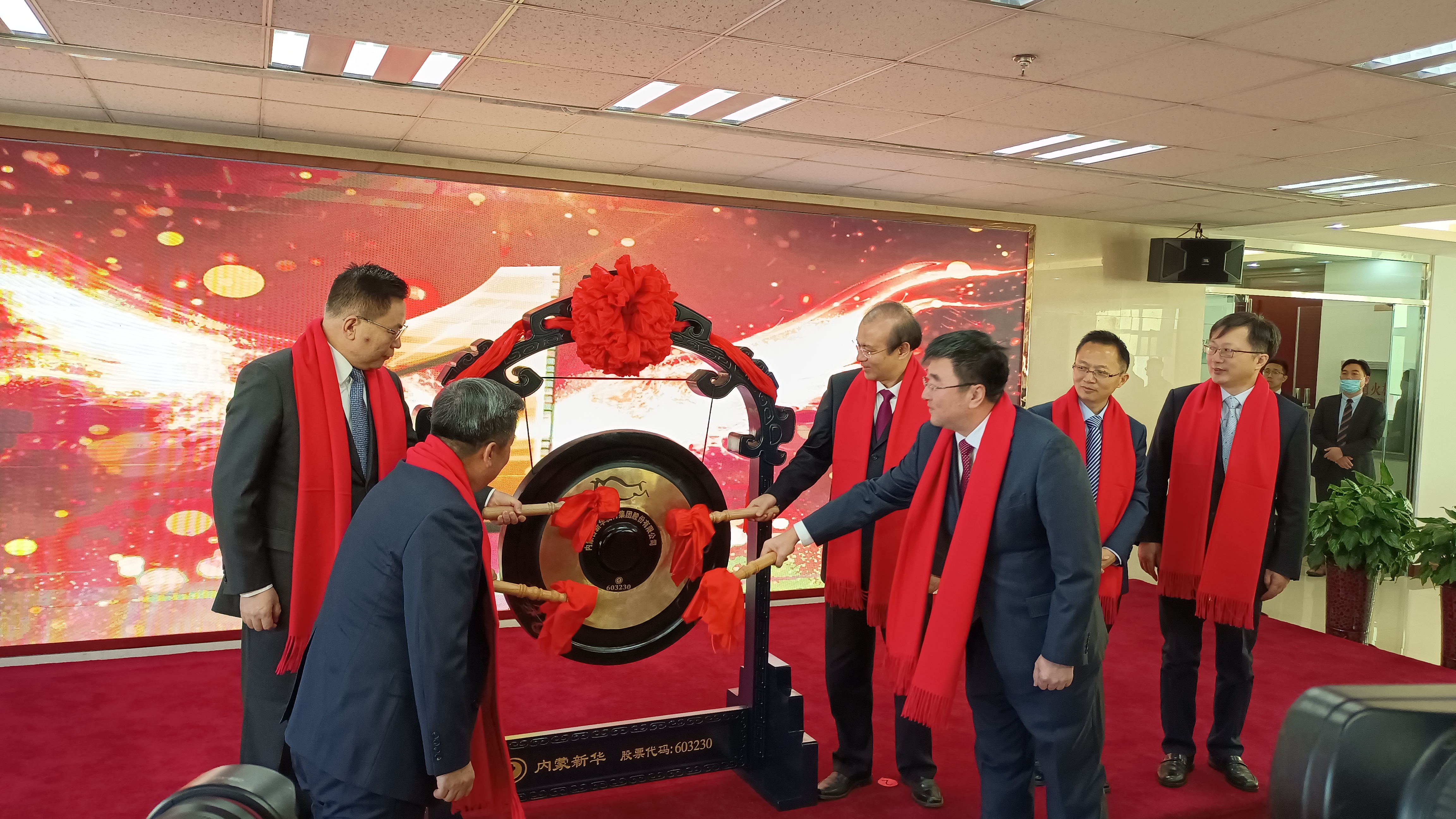 内蒙古自治区党委常委、呼和浩特市委书记包钢,自治区党委常委、宣传部部长郑宏范,自治区地方金融监督管理局局长姜华,内蒙古新华发行集团股份有限公司党委书记、董事长秦建平共同为内蒙新华鸣锣开市,宣告内蒙新华正式登陆资本市场