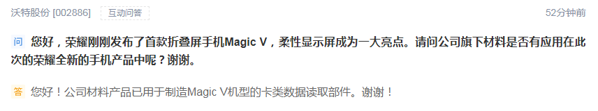 沃特股份:公司产品已用于制造Magic V机型卡类数据读取部件