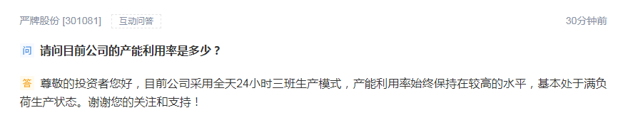 上证报中国证券网讯 严牌股份1月12日在互动平台回答投资者提问时表示,目前公司采用全天24小时三班生产模式,产能利用率始终保持在较高的水平,基本处于满负荷生产状态。