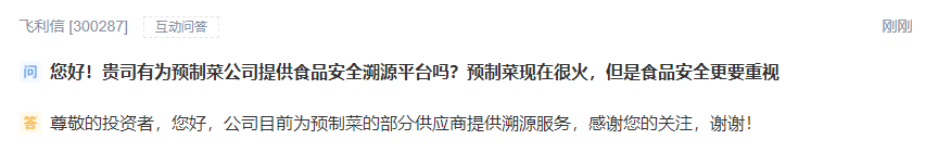 飞利信:公司目前为预制菜的部分供应商提供溯源服务