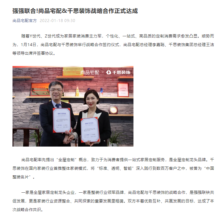 上证报中国证券网讯 据尚品宅配官方微信公众号1月18日消息,1月14日,尚品宅配与千思装饰举行战略合作签约仪式。