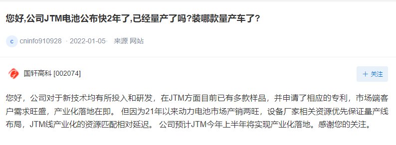 上证报中国证券网讯 国轩高科1月19日在深交所互动易平台表示,公司对于新技术均有所投入和研发,在JTM方面目前已有多款样品,并申请了相应的专利,市场端客户需求旺盛,产业化落地在即。但因为2021年以来动力电池市场产销两旺,设备厂家相关资源优先保证量产线布局,JTM线产业化的资源匹配相对延迟。公司预计JTM今年上半年将实现产业化落地。