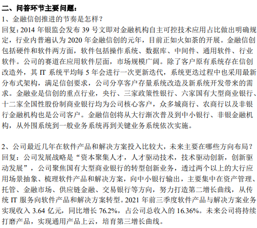 上证报中国证券网讯 根据京北方1月21日披露的1月18日投资者关系活动记录表,公司发展战略是“资本聚集人才,人才驱动技术,技术驱动创新,创新驱动发展”,公司聚焦国有大型商业银行的转型创新业务,透过两个以上的大行应用场景抽象、梳理软件产品和解决方案,向中小银行输出,主要集中在资产管理、托管、金融市场、供应链金融、交易银行等方向,努力打造第二增长曲线,从传统IT服务向软件产品和解决方案转型。2021年前三季度软件产品与解决方案业务实现收入3.64亿元,同比增长76.2%,占公司总收入的16.36%。未来公司将持续打磨产品,实现通用产品上云,培育第三增长曲线。