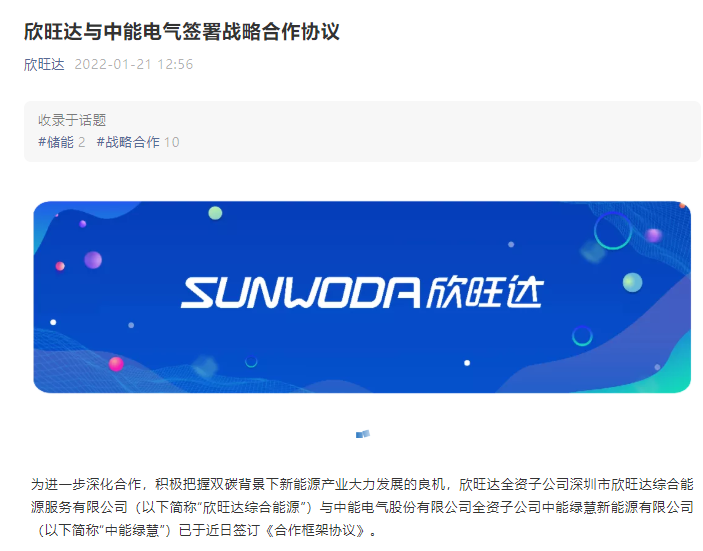 上证报中国证券网讯 据欣旺达微信公众号1月21日消息,为进一步深化合作,积极把握双碳背景下新能源产业大力发展的良机,欣旺达全资子公司深圳市欣旺达综合能源服务有限公司(以下简称“欣旺达综合能源”)与中能电气股份有限公司全资子公司中能绿慧新能源有限公司(以下简称“中能绿慧”)已于近日签订《合作框架协议》。