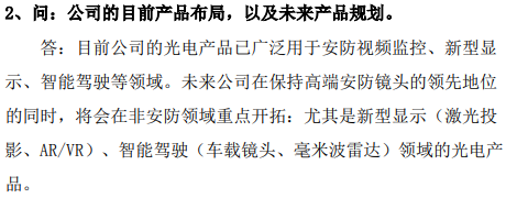 上证报中国证券网讯 根据联合光电1月21日发布的1月20日投资者关系活动记录表,目前公司的光电产品已广泛用于安防视频监控、新型显示、智能驾驶等领域。未来公司在保持高端安防镜头的领先地位的同时,将会在非安防领域重点开拓:尤其是新型显示(激光投影、AR/VR)、智能驾驶(车载镜头、毫米波雷达)领域的光电产品。