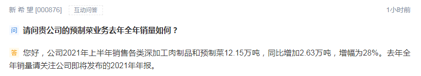 此外,新希望表示,公司2021年上半年销售各类深加工肉制品和预制菜12.15万吨,同比增加2.63万吨,增幅为28%。