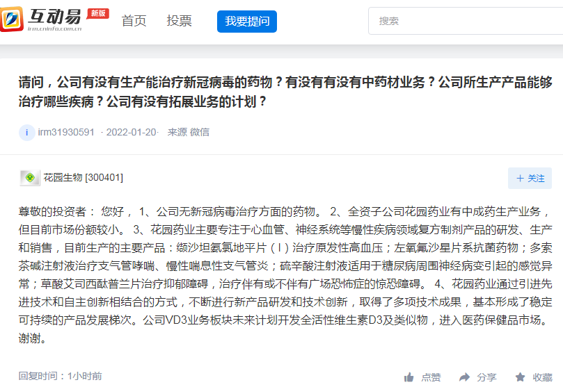 上证报中国证券网讯 花园生物1月25日在互动平台回答投资者提问时表示,全资子公司花园药业有中成药生产业务,但目前市场份额较小。
